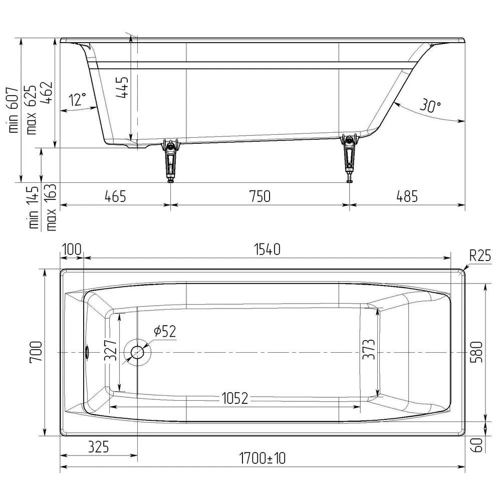 Ванна устанавливается строго горизонтально (по уровню), слив воды обеспечивается уклоном дна в 1,5 градуса.