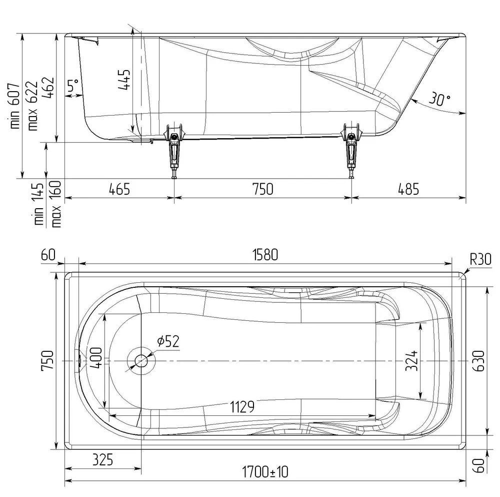 Ванна устанавливается строго горизонтально (по уровню), слив воды обеспечивается уклоном дна в 1,5 градуса.