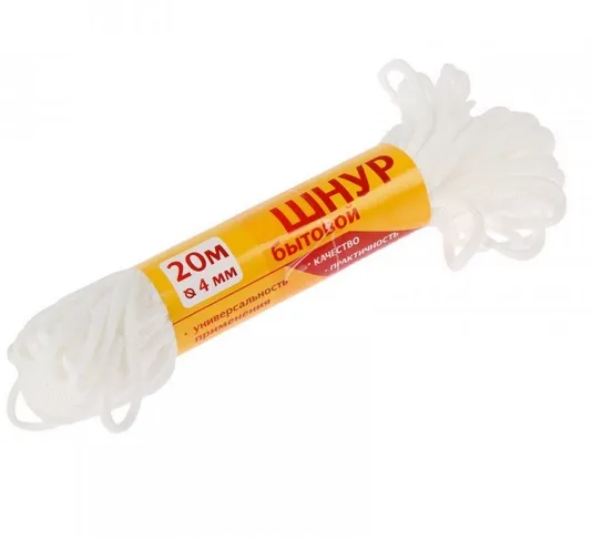 Шнур бытовой толщиной 4 мм незаменим для хозяйственных нужд. Шнур изготовлен из синтетического волокна, которое надолго сохраняет привлекательный внешний вид и не боится перепадов температуры и влажности, не разрушается от воздействия ультрафиолетовых лучей.