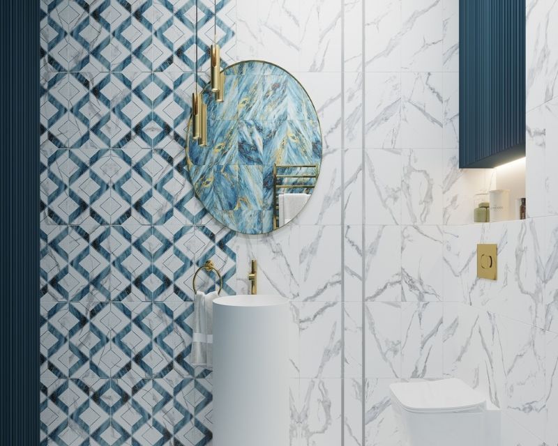 Встречайте: тренд 2021 года — голубой мрамор с яркими прожилками в сочетании с благородным белым Carrara, который на сегодняшний день находится на пике популярности. С коллекцией «Виченца» можно создать светлый интерьер, используя только белый мрамор. Акцентом в данном случае будет выступать рельефная поверхность, создающая объем и световые блики в помещении. Визитная карточка коллекции — эффект среза камня, имитирующего золотые прожилки на яркой базовой плитке.