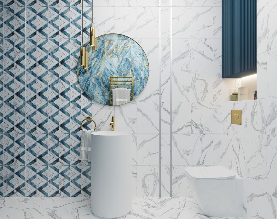 Коллекция Виченца — это голубой мрамор с яркими прожилками в сочетании с благородным белым Carrara. С коллекцией «Виченца» можно создать светлый интерьер, используя только белый мрамор. Акцентом в данном случае будет выступать рельефная поверхность, создающая объем и световые блики в помещении. Визитная карточка коллекции — эффект среза камня, имитирующего золотые прожилки на яркой базовой плитке.