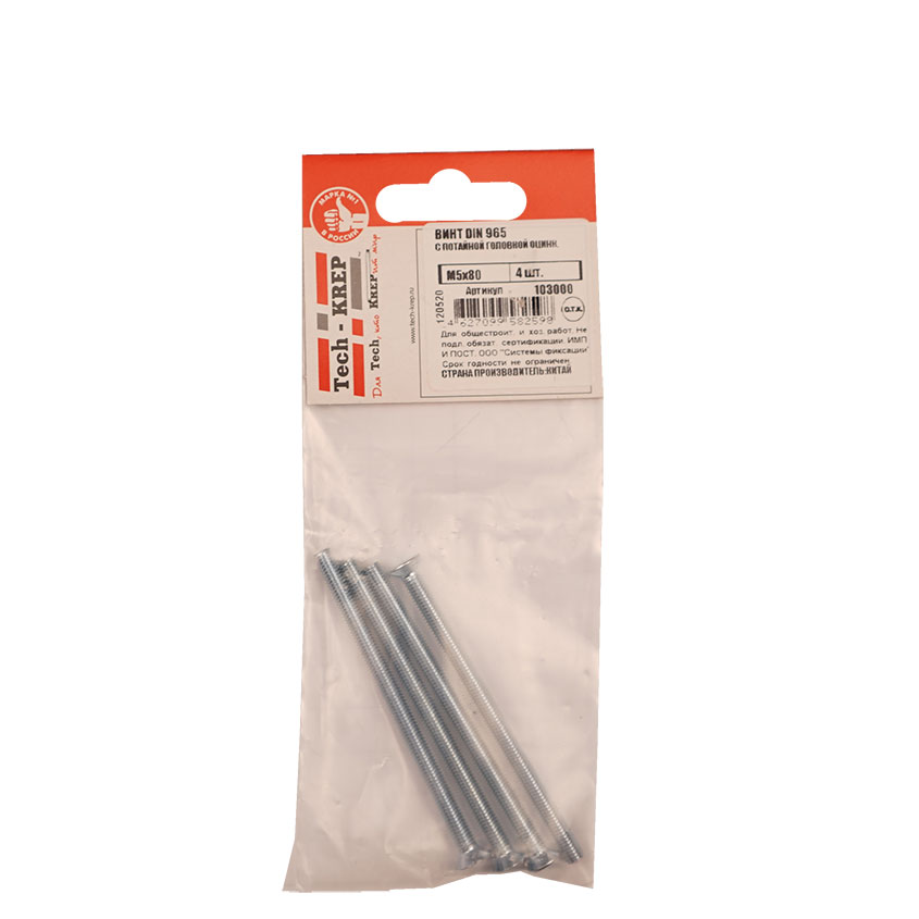Винт DIN965 М5х80мм имеет потайную головку с крестообразным шлицем PH и полную метрическую резьбу. Изготовлен из углеродистой стали с антикоррозионным цинковым покрытием.