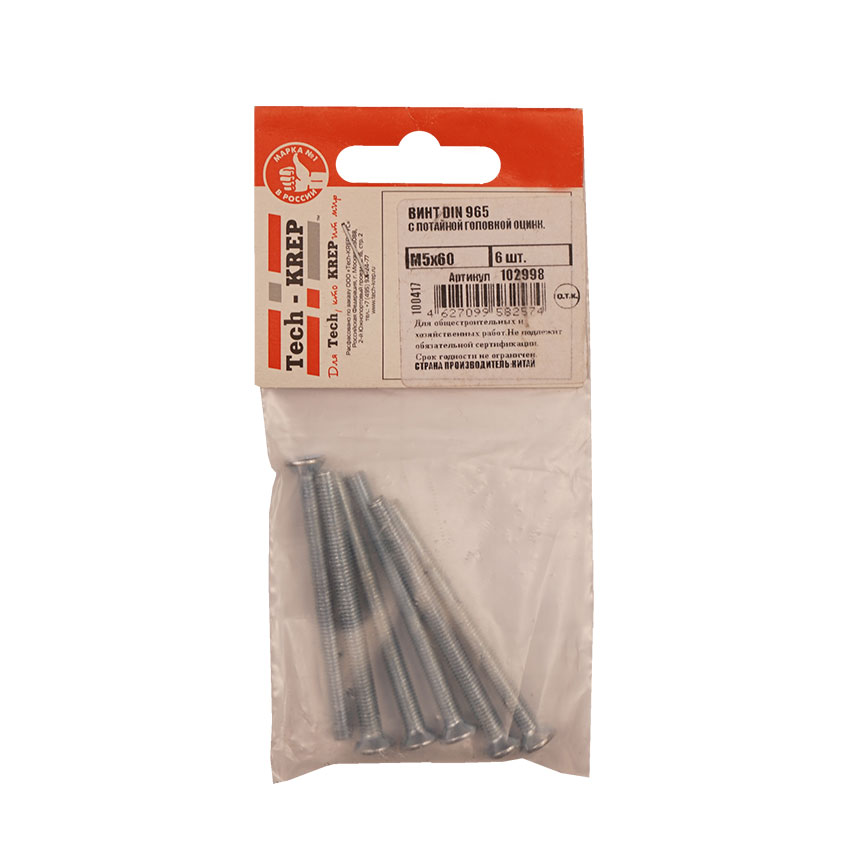 Винт DIN965 М5х60мм имеет потайную головку с крестообразным шлицем PH и полную метрическую резьбу. Изготовлен из углеродистой стали с антикоррозионным цинковым покрытием.