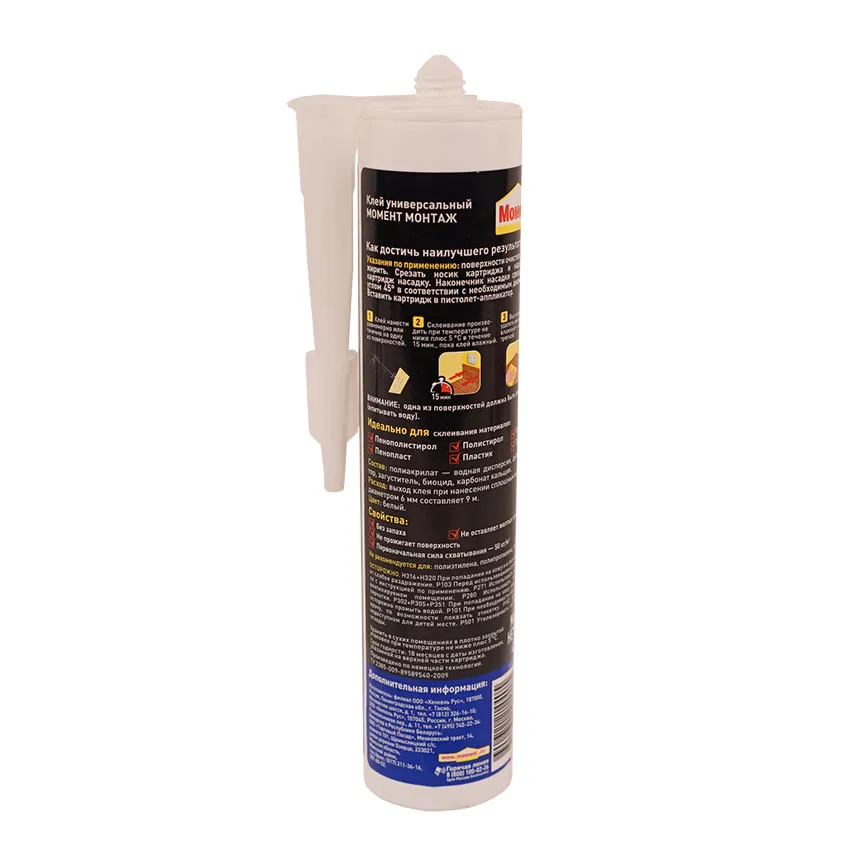 Надежно склеивает стиропор, дерево, металл, ПВХ, керамика, ДСП, МДФ, гипсокартон, пробка, полистирол, пенопласт, гипс и другие подобные материалы. Подходит для: Приклеивания стеновых панелей из дерева, ПВХ, пробки, гипрока, Приклеивания изоляционных панелей, декоративных деталей, профилей, Установка подоконников и дверных рам, Приклеивания плинтусов и декоративных фризов.